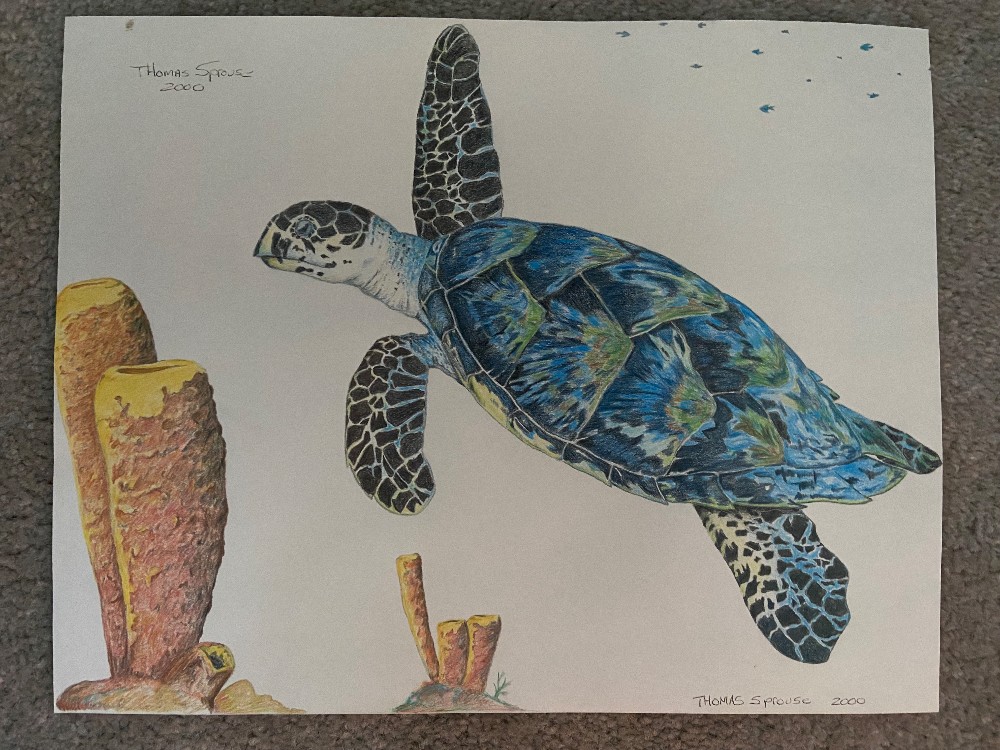 Original Colored pencil art by Thomas of Ivory Crow Knives… Sea turtle framed 11x14