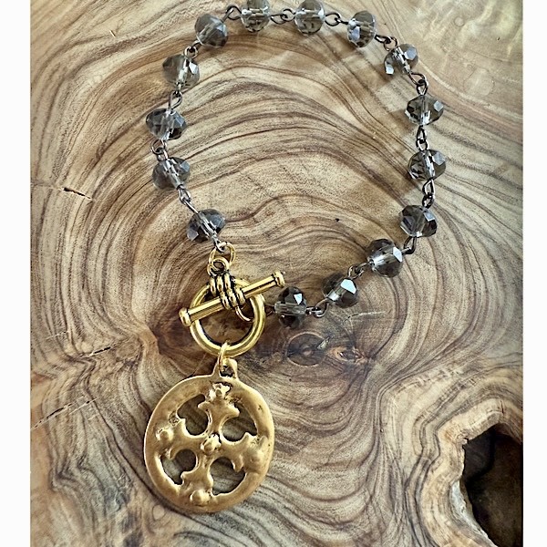 DToggle bracelet of linked iridescent crystal beads and matte gold cross charm