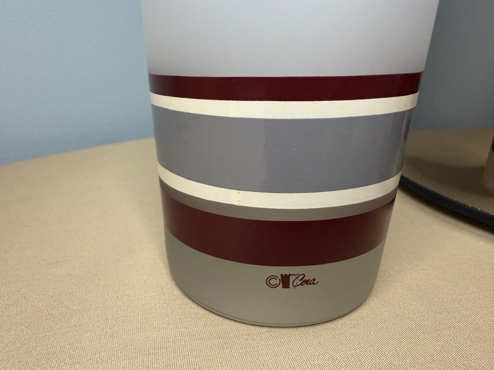 Vintage frosted Cera tumbler highball. Garnet, gray, and white stripes, in excellent condition. Perfect for the Gamecock lovers bar! 5 5/8" tall.