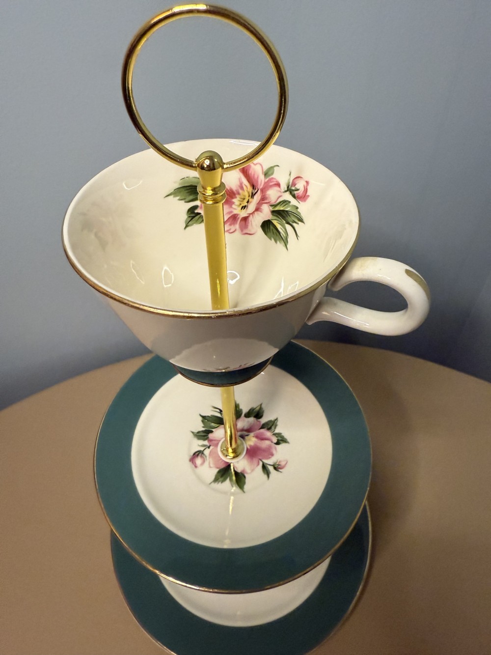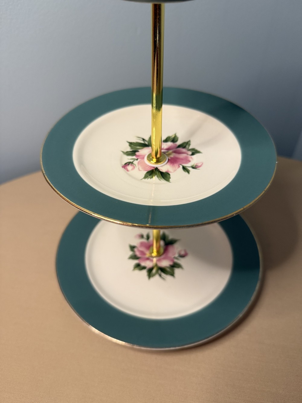3 tier teal w/ pink flower vintage plate and teacup stand