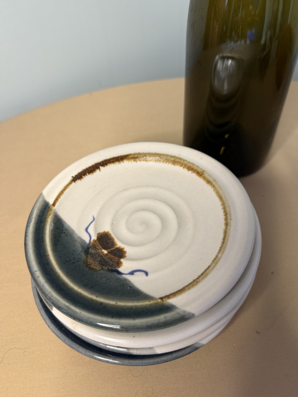 Signed Handmade pottery appetizer plate. Stoneware with cream, brown, and blue glazes. Each measures roughly 5.25", slight variations since they are handmade.