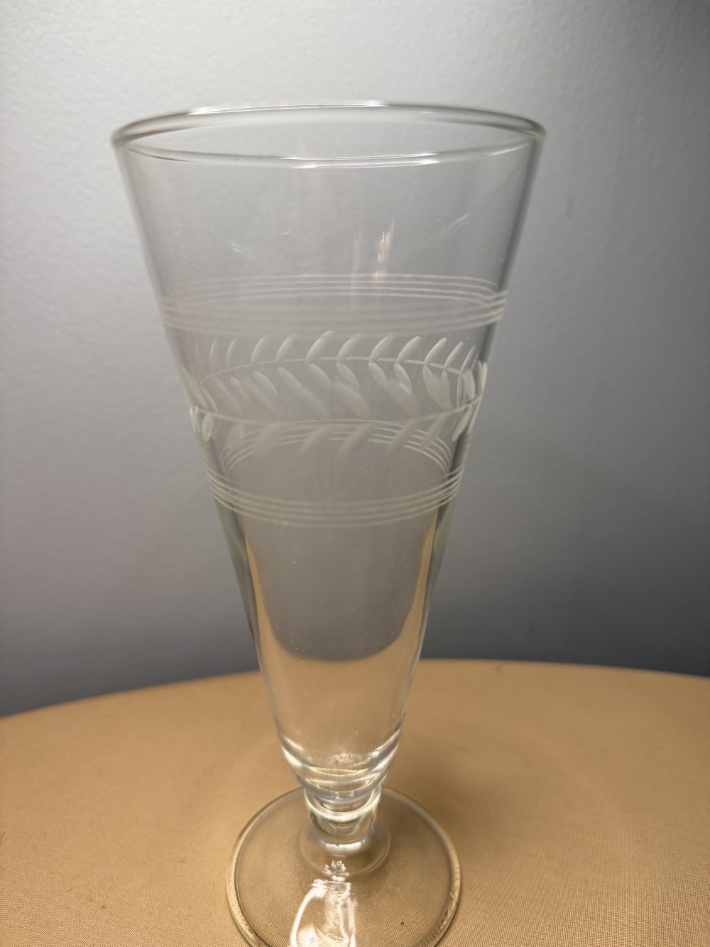 Anchor Hocking laurel leaf etched glass pilsner. Measures 7.5" high. No chips or scratches.