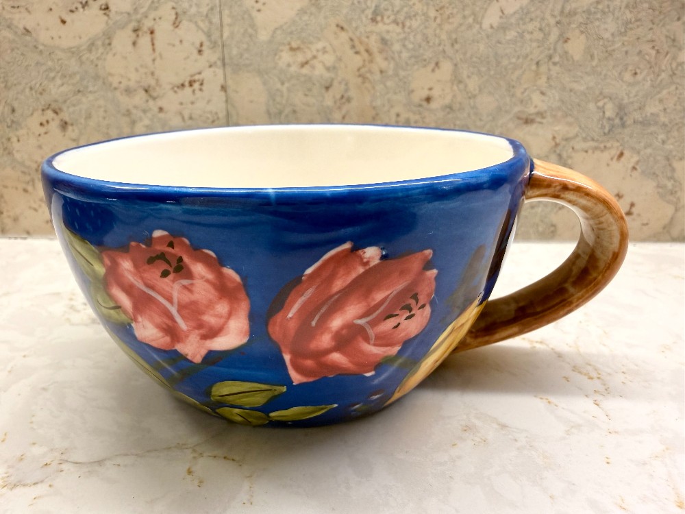 Low, wide cobalt blue mug / teacup featuring a floral design on one side and stack of books on the side. Glazed stoneware, no chips or cracks. Measures 4.75" across by 2.5" tall.
