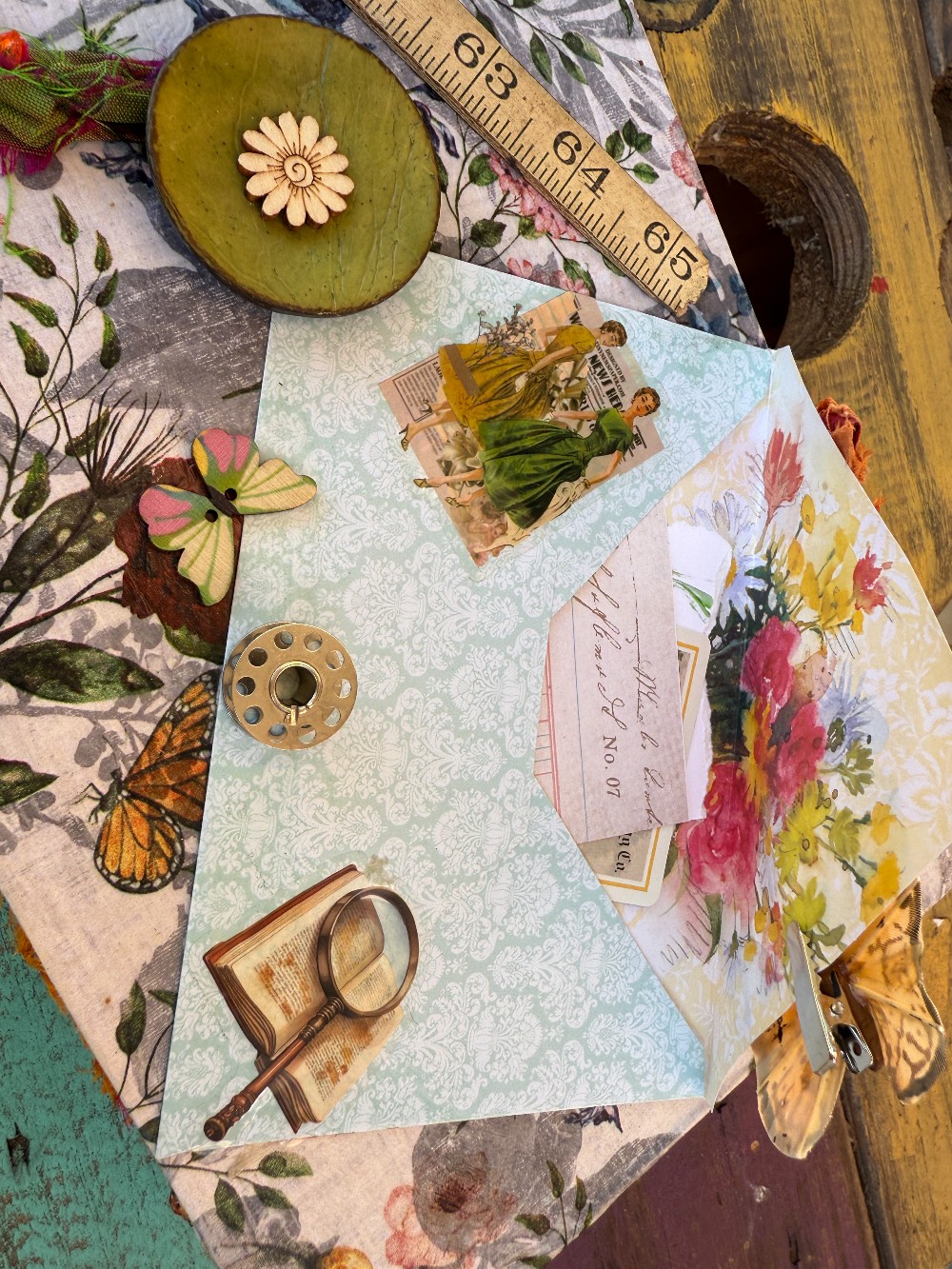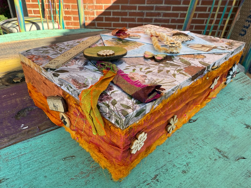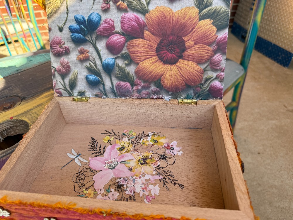 Once an ordinary cigar box, now transformed into a keepsake layered with meaning. Hand-embellished by Renee of Rainy Day Vintage, this box features vintage floral prints, stitched ribbon trim, and a collage of treasures... a butterfly, an old measuring tape, and a wooden bloom.
