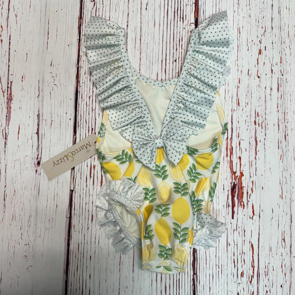 Girl's Swim Suit in Lemon Print with Green Polkadot Ruffle and Bow Back by Marco & Lizzy