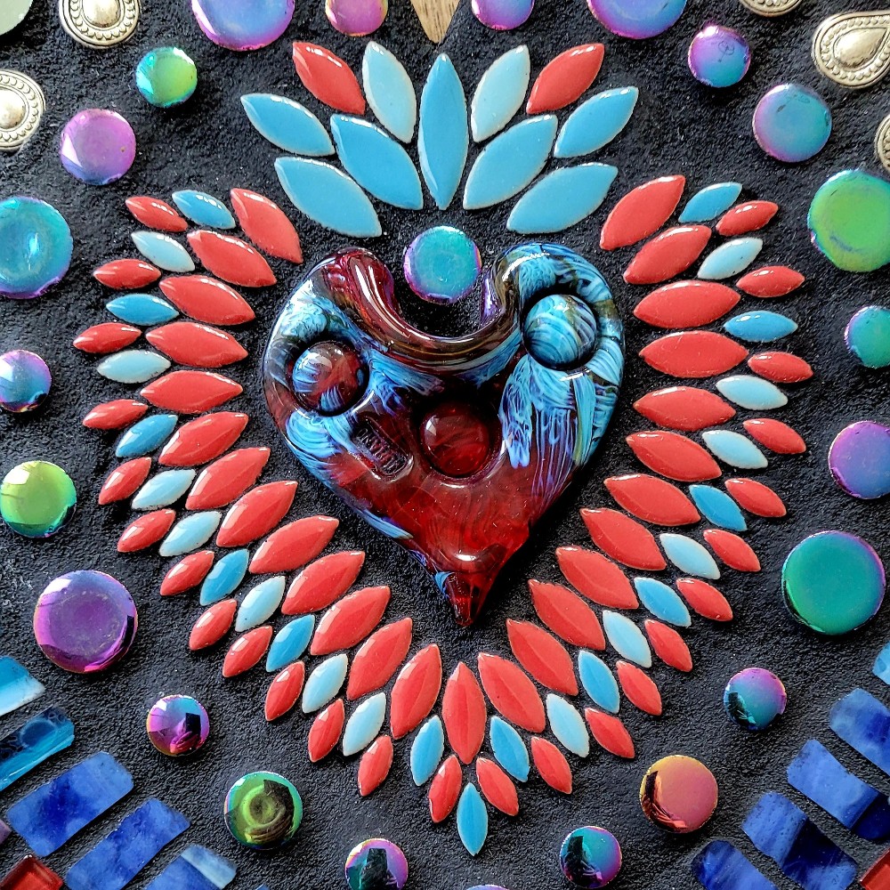 Large Mosaic heart made with stained glass, glass, mirror & ceramic tiles on a wood base. The center focal point is a fused geniune Murano glass heart. Sides & back are painted and poly sealed. There is a wire hanger on the reverse side. Measures 13.5"L x 13.5"W x .75D For indoor use only.