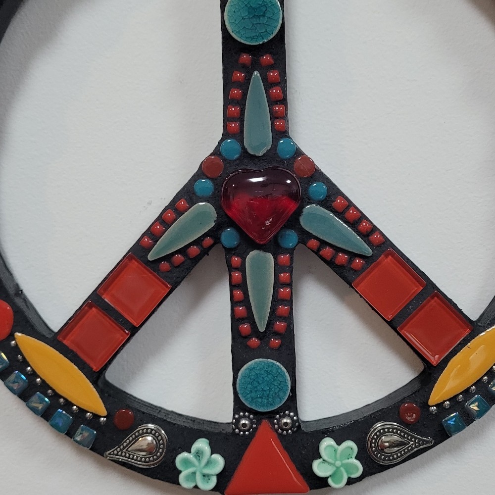 Mosaic Peace Sign adorned with a red glass heart focal point. This peace sign is 10 inches in diameter and it is made on a wood base with glass & ceramic tiles and silver embellishments. Includes D-ring hanger on reverse side. For indoor use only.