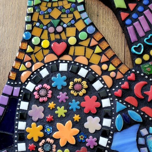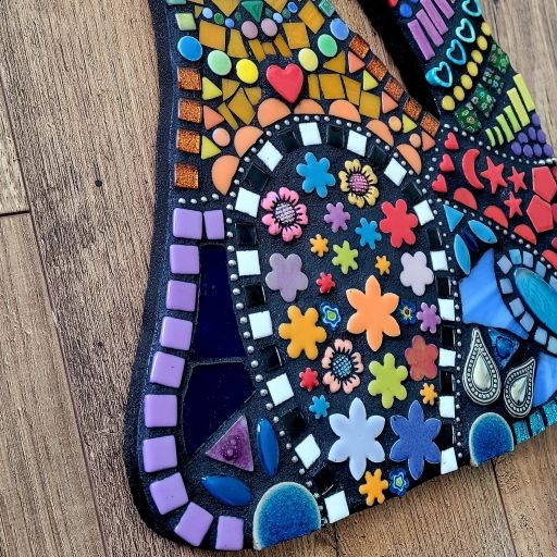 Mosaic kitty cat plague made on a wood base with stained glass, glass & ceramic tiles with silver embellishments. Very colorful and this cat would be a beautiful and unique addition to any home! Measures 12"L x 9.5"W x .5"D Comes ready to hang with 2 D-Ring hangers. For indoor use only