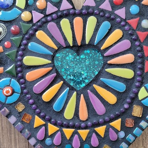This Mosaic Heart is an awesome way to bring some love into your home! It is made with glass & ceramic tiles, stained glass, bead, carbochons, milleflori and metallic embellishments. The center focal point is a glitter resin heart. The heart is 10"L x 10"W and it is made on a wood base & grouted in black. The sides and back have been painted & sealed. It comes with a D-Ring hanger so it is ready to hang. For inside use only!