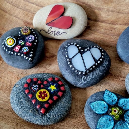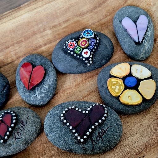 Oval river rock adorned with stained glass, milleflori and stainless steal ball chain. Safe for outdoor use.
