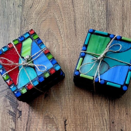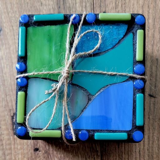 Mosaic wood coaster with stained glass & glass tile. Sides and back are painted with acrylic paint and poly sealed. Felt feet are applied for furniture protection. Comes in a set of 4 coasters. Choice of red, blue, teal & lime OR Blue, Teal & green.