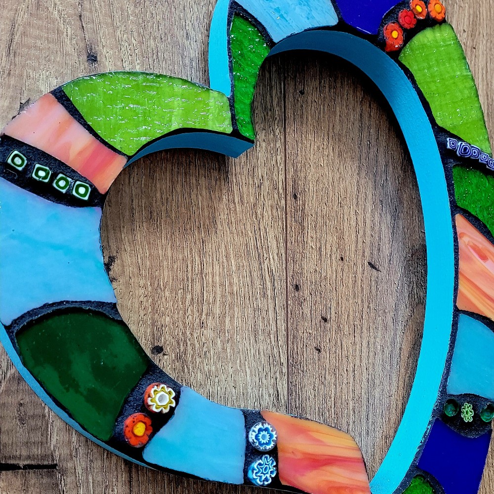 Mosaic heart outline plaque adorned with stained glass in shades of royal blue, teal, peach, greens and milliflori for added interest. Heart is made on wood and measures 11"W x 12"L x .75D. Sides & back are painted in acrylic paint & poly sealed. Comes with D-Ring hanger. For inside use only.