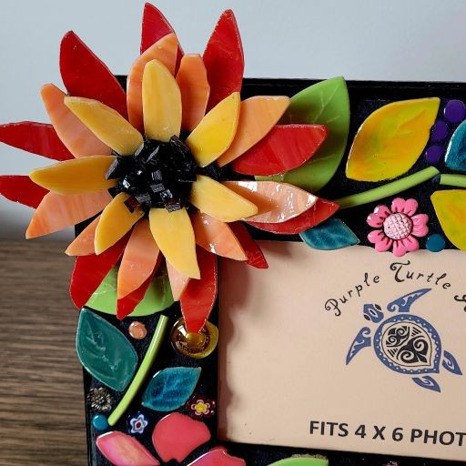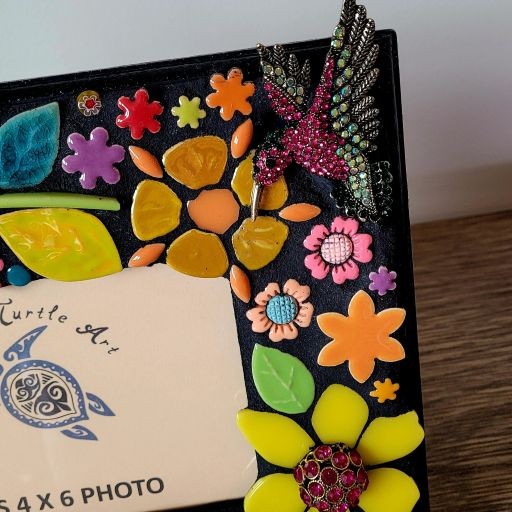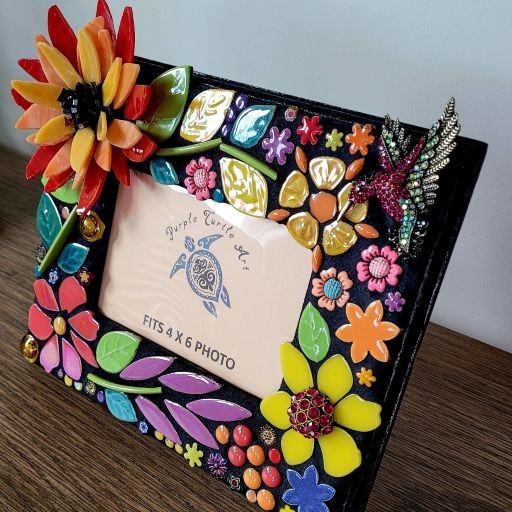 3D Mosaic Photo Frame embellished with 3D flower and rhinestone hummingbird. This colorful frame is sure to WOW everyone! Measurements of the outside of the frame are 10.25"L x 8.25"W and it fits a 4" x 6" photograph. For inside use only.