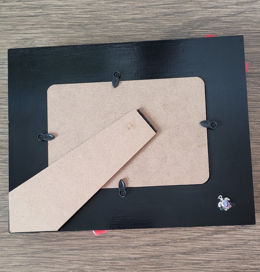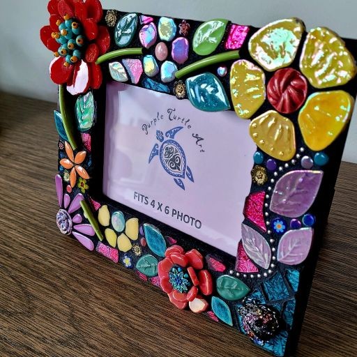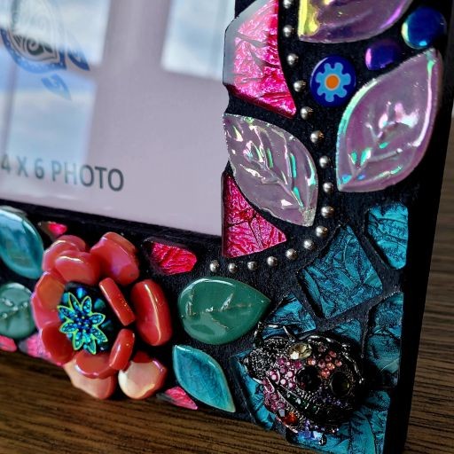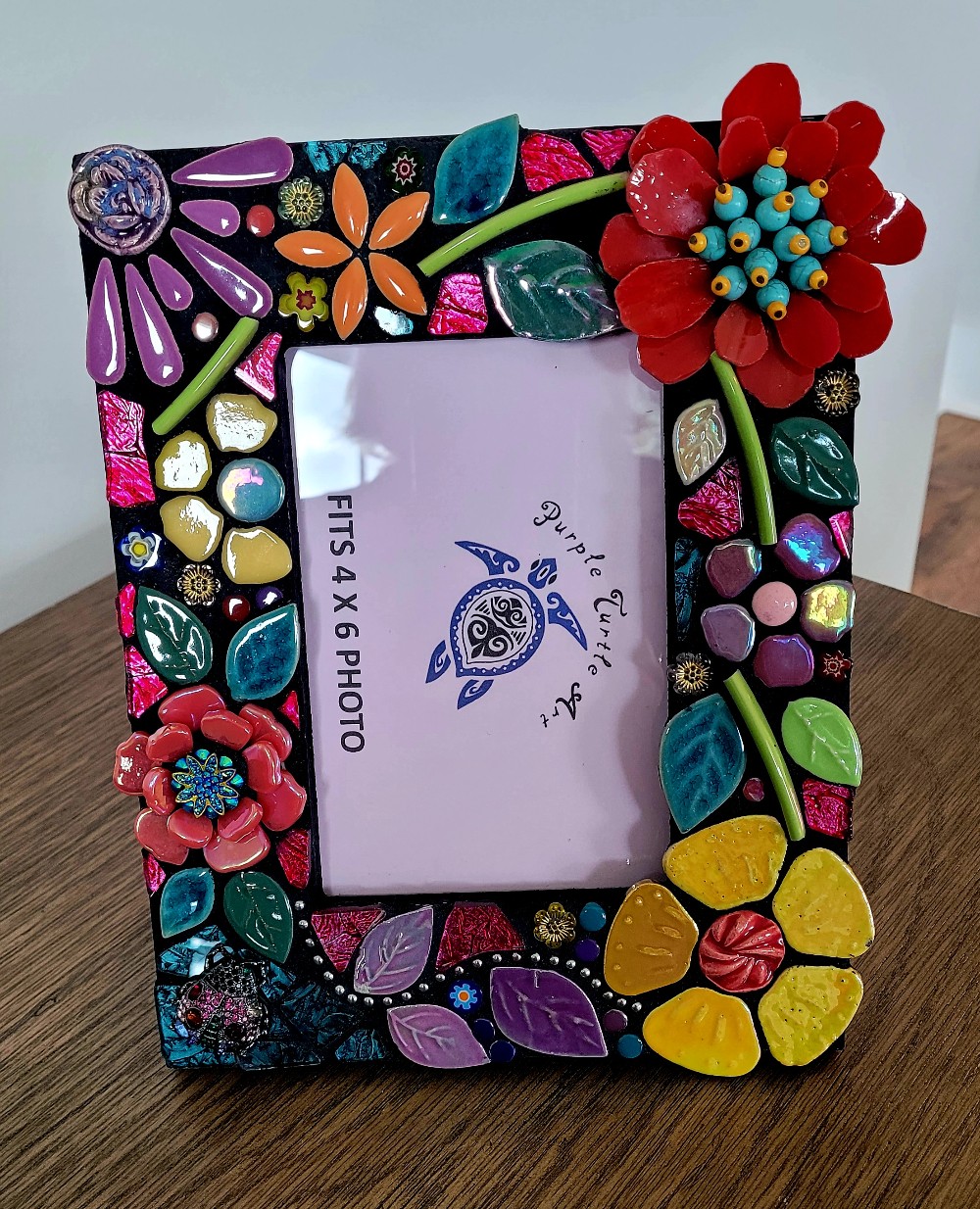 Colorful 3D Mosaic frame adorned with 3D glass flowers and rhinestone beetle as the focal points. Overall measurements are 9.5"W x 7.5"H and it fits a 4" x 6" photo. Orientation can be horizontal or vertical.