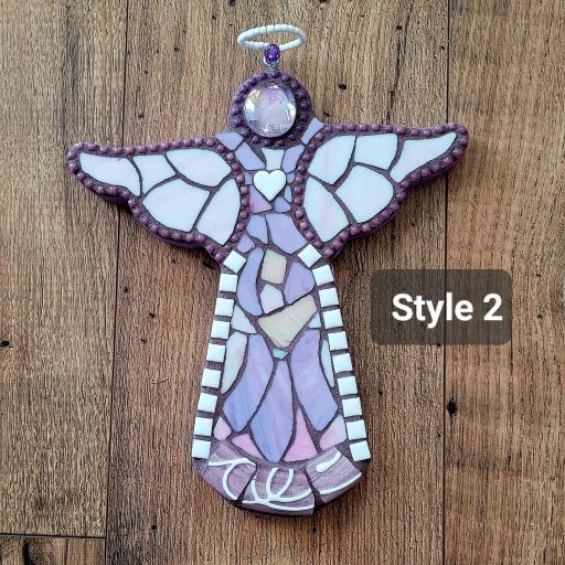These Angels are made with love and bring blessings to any home! The mosaic is done with stained glass, ceramic and glass tiles, beads, carbochons and metallic embellishments. Each angel is adourned with a beaded wire halo! Wood base with painted sides & back & sealed with a poly sealant. Comes with a D-Ring hanger so its ready to hang! Measures 9"W x 11"L. For indoor use only.