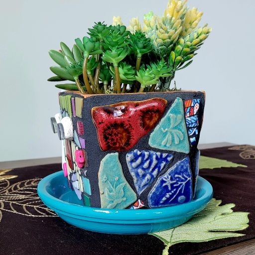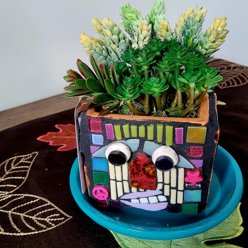 Whimsical 4 in square flowerpot done in a "pique assiette" style of mosaic with crockery and tile. Adorned with a face that sure to brighten the darkest of days! It comes with the matching saucer and faux succulents.