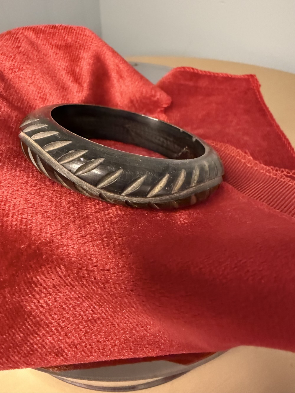 Vintage carved Bakelite bracelet in warm black with a slightly worn patina.