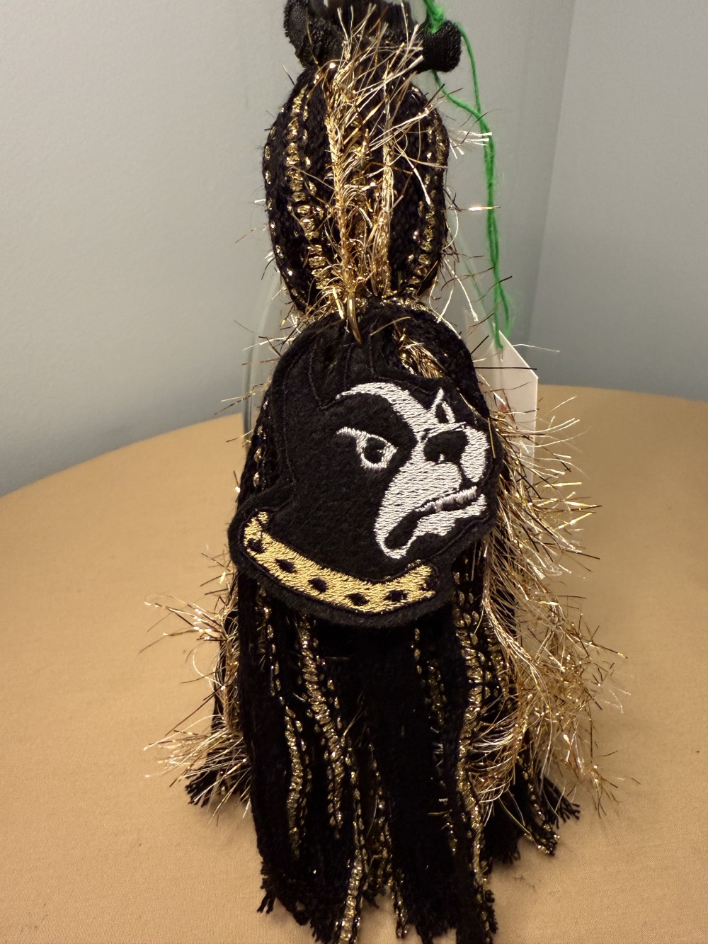 Wofford terriers black and metallic gold flat yarn tassel. Perfect for a hostess gift with a bottle of wine or your tailgate decor!
