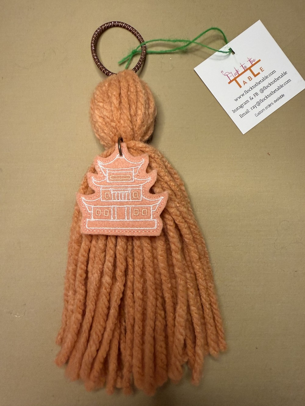 Soft coral yarn tassel with embroidered pagoda charm. Dress up your bar, coffee station, or hang from a lamp or drawer pull. Also makes a great hostess gift with a bottle of wine or bubbly!