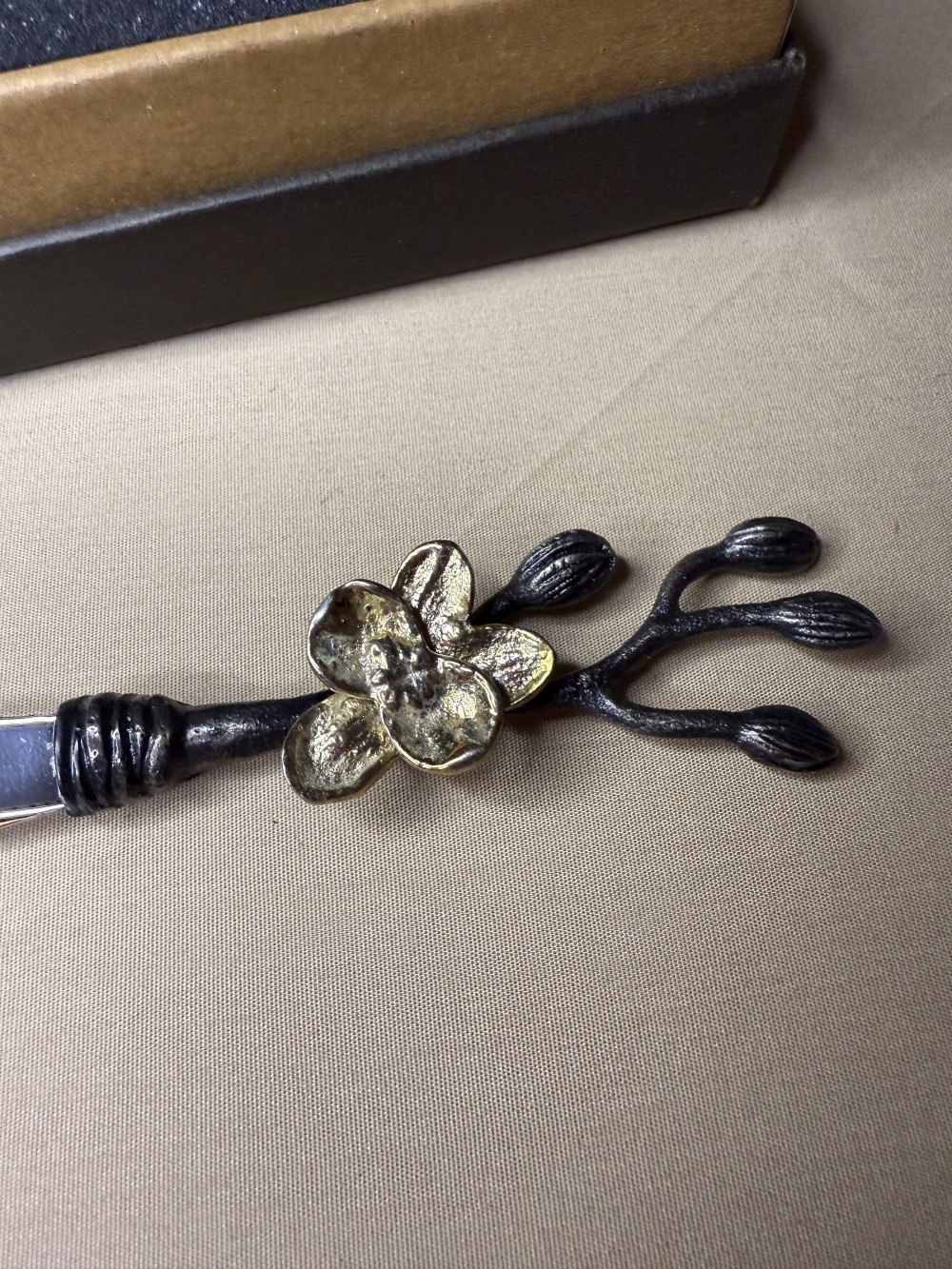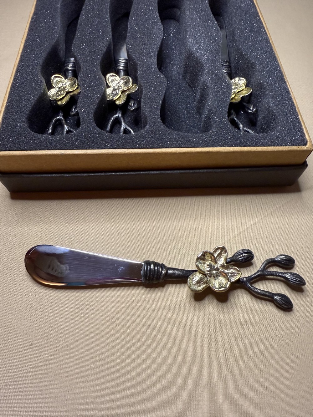 Set of 4 NEW in box (unused) artist designed spreaders by Michael Aram. Exquisite detail in these branch with floral multi metal spreaders. In original box ready for gifting!
