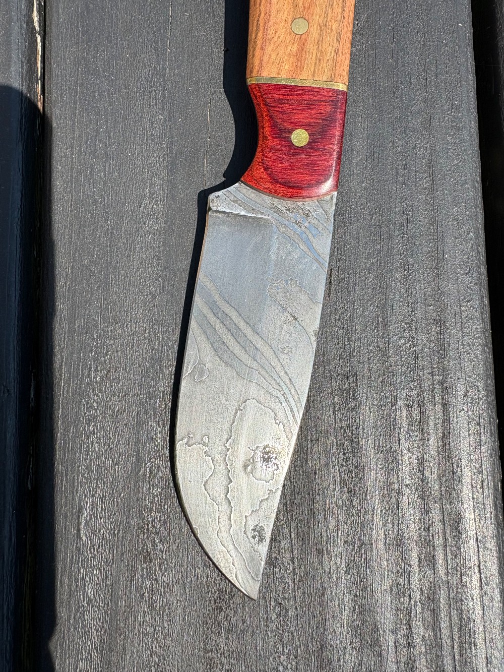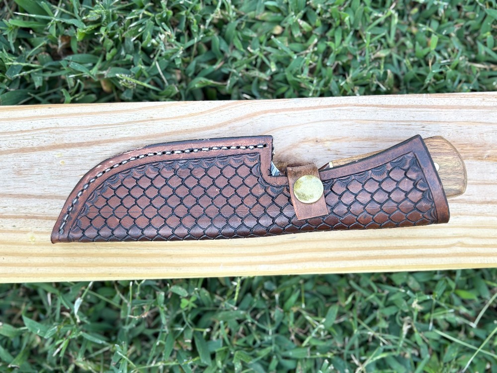 Hand forged 1084 15N20 knife twist Damascus with Jatoba wood handle, laminated stabilized bolster with hand stamped hand stitched sheath.