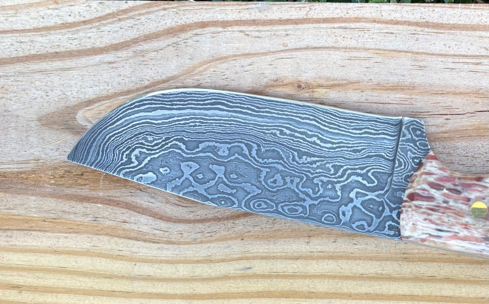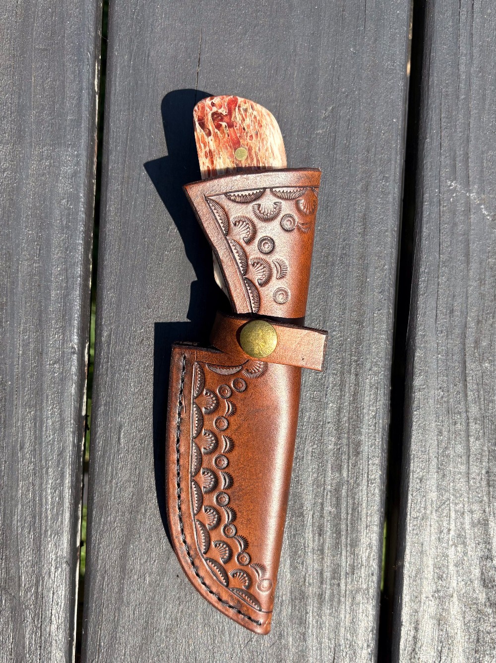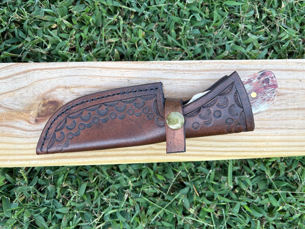 Random pattern Damascus knife with kudu antler (ethically sourced) handle. Hand stamped hand stitched leather sheath.