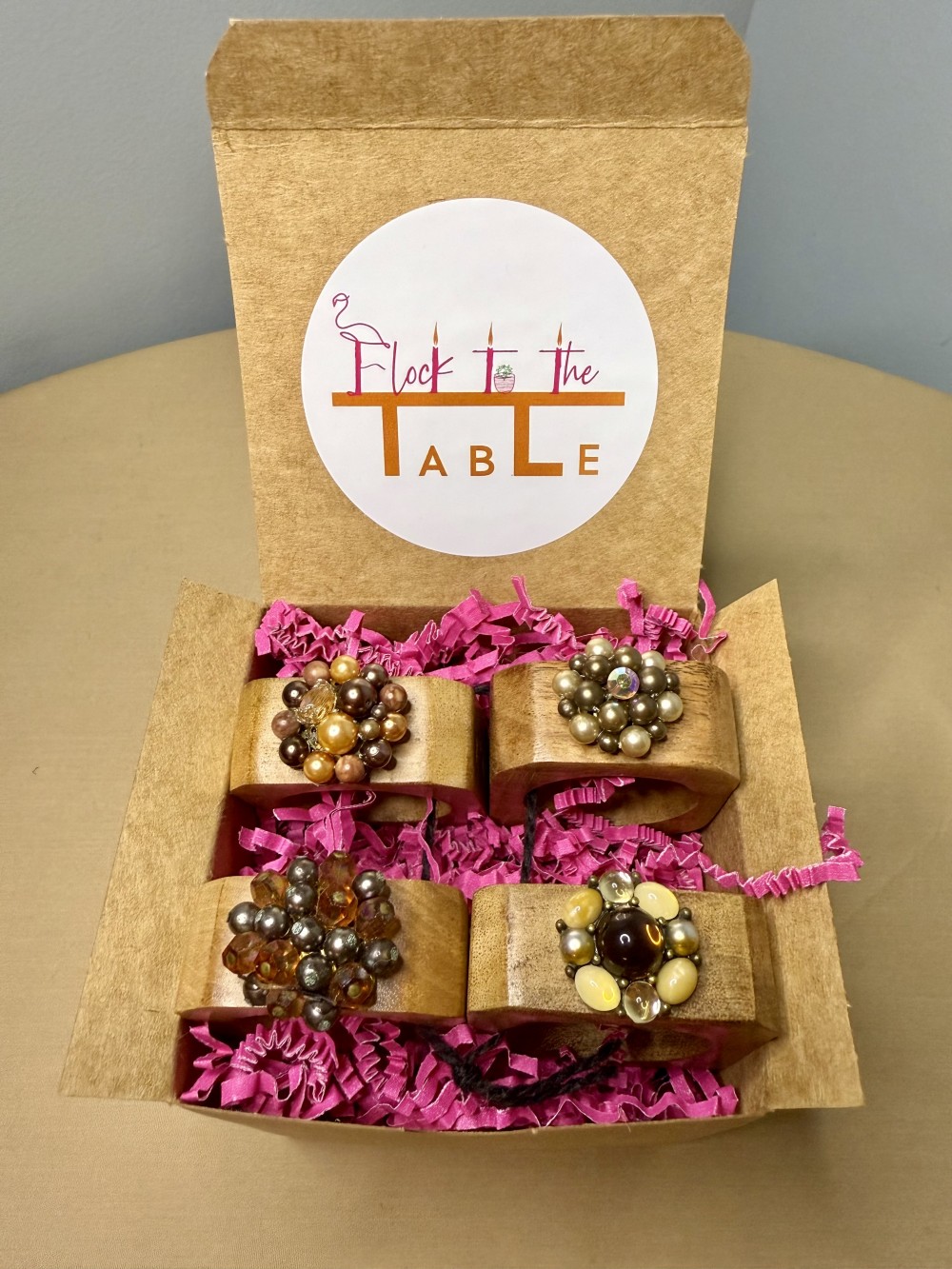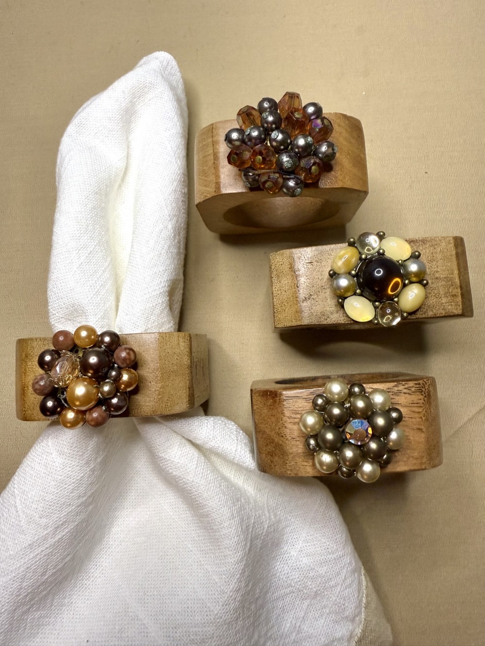 Set of 4 curated shades of brown napkin rings designed from vintage jewelry. This set includes 4 round beaded vintage discs in various shades of brown and pearls. Comes in festive packaging ready for gifting. Mix and match with other sets to use year round!