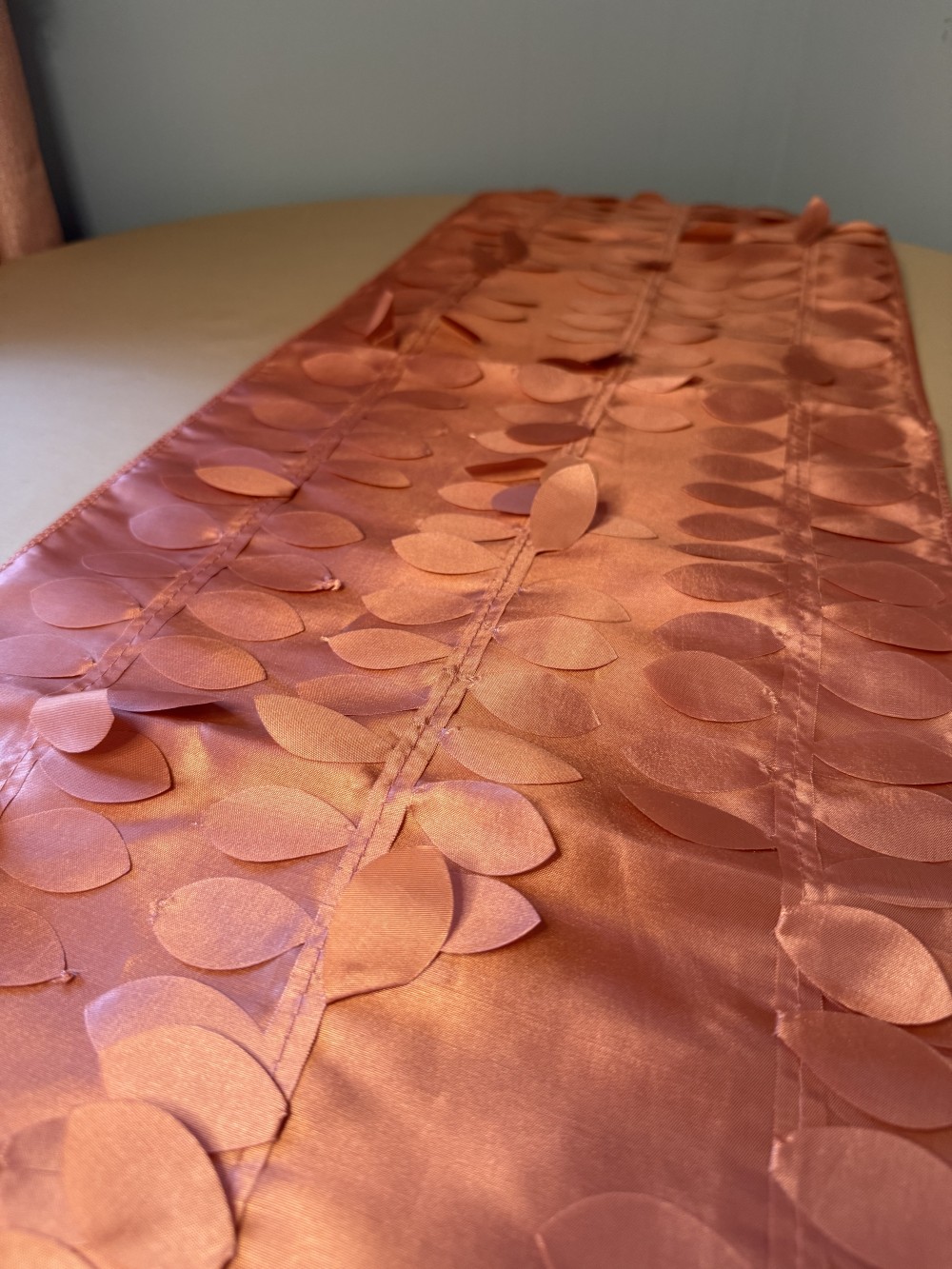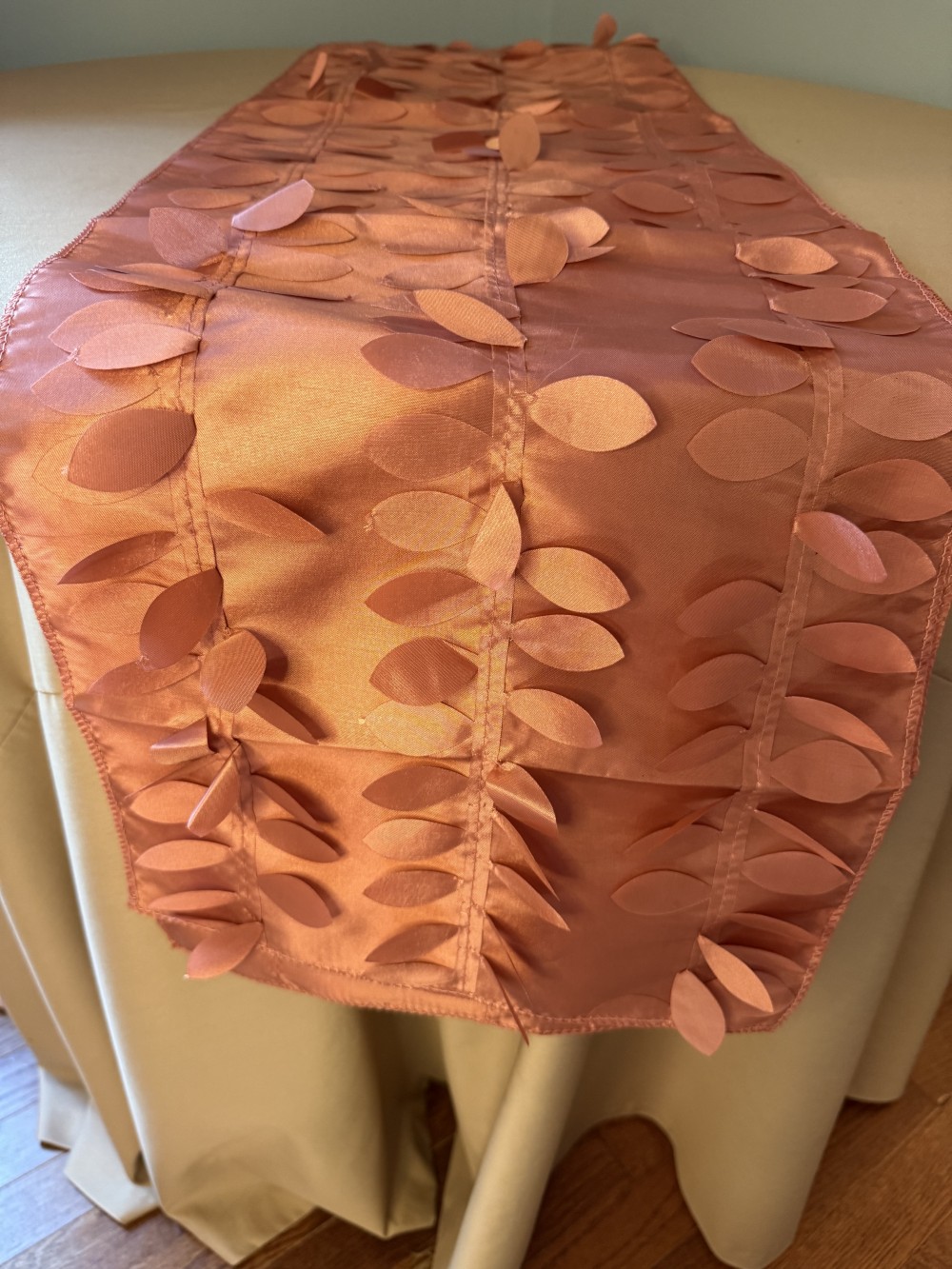 Copper colored faux satin table runner. Measures 108" long. Flutter leaf design perfect for your fall tablescape!