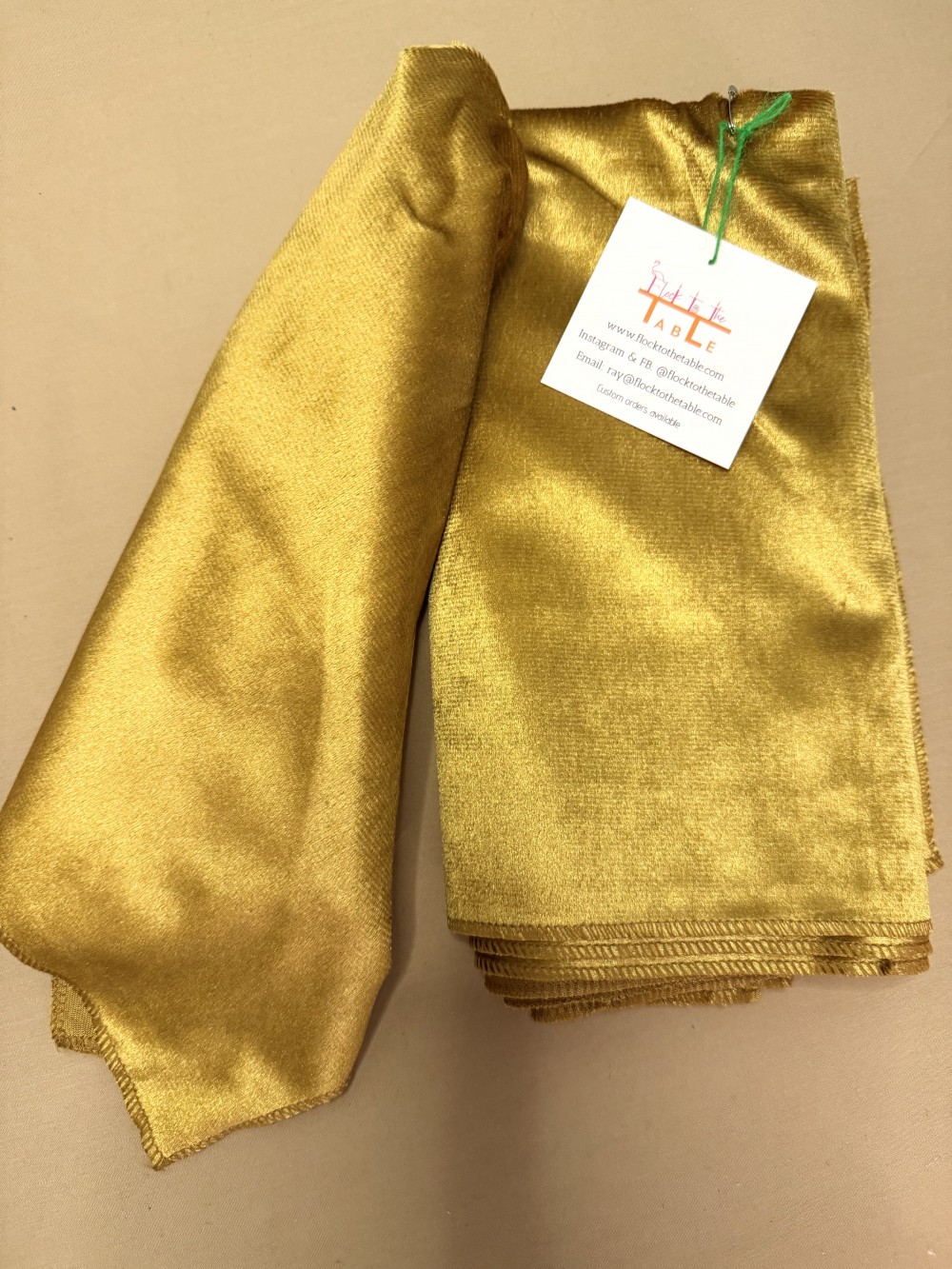 Set of 4 Gold colored poly (washable) velvet napkins. Gorgeous rich moody look for your tablescape!