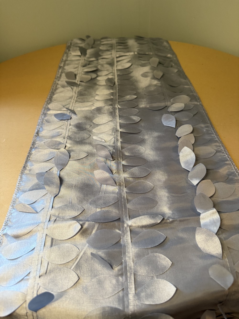 Soft ice blue flutter leaf table runner. 108" long. Poly satin washable.