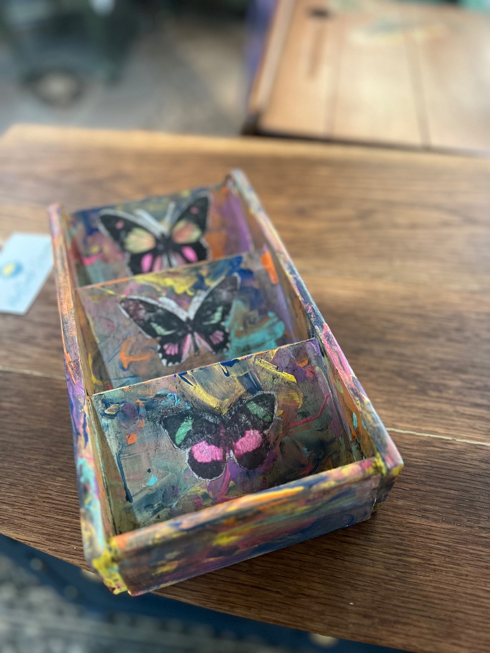 Colorful combination of DIY and Daydream paints on mail sorter with butterflies decoupaged on panels