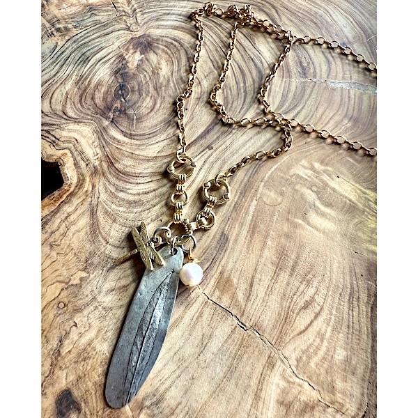 1Charming long necklace in mixed metals with Leaf, Dragonfly and Pearl