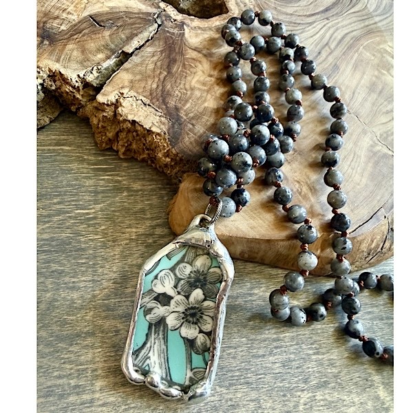 Broken china soldered pendant in aqua w/gray & white flowers on long knotted larvakite stone bead strand