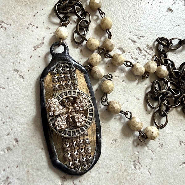 Vintage assemblage soldered pendant on long bronze chain w/linked cream czech glass beads