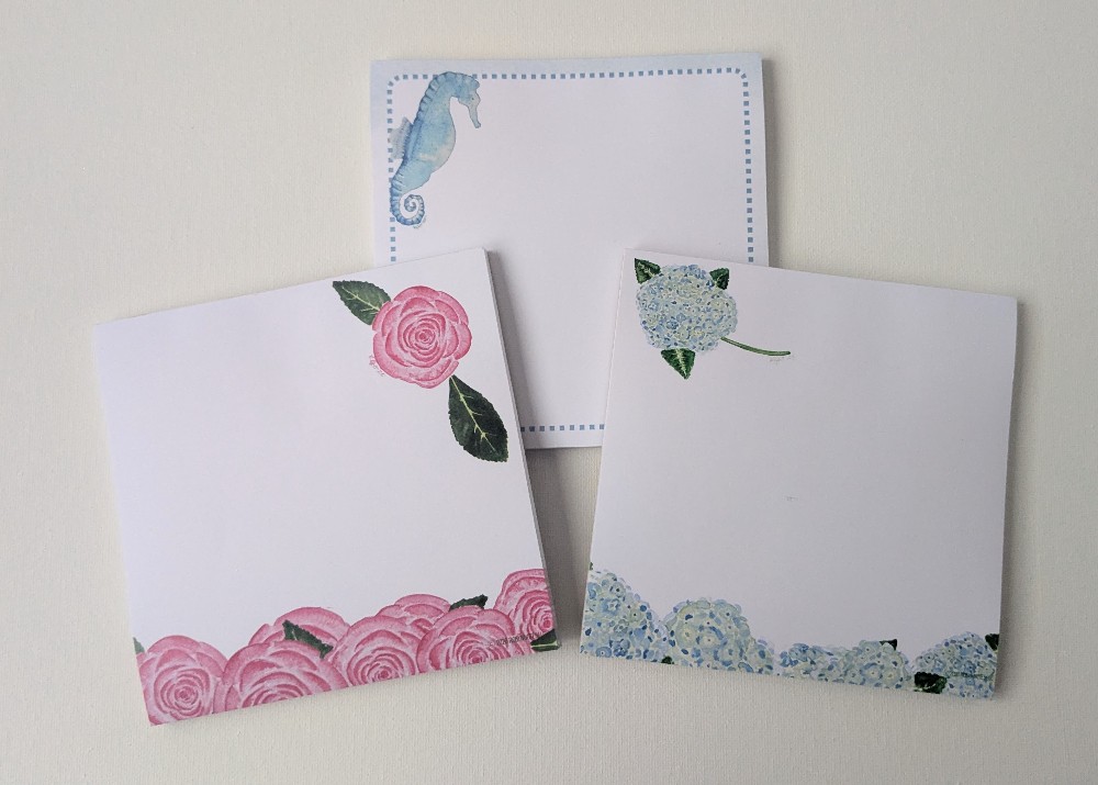 Camellia print Notepad-. 5 x 5 in, 50 pages, 60 PT paper, brown chipboard backing
