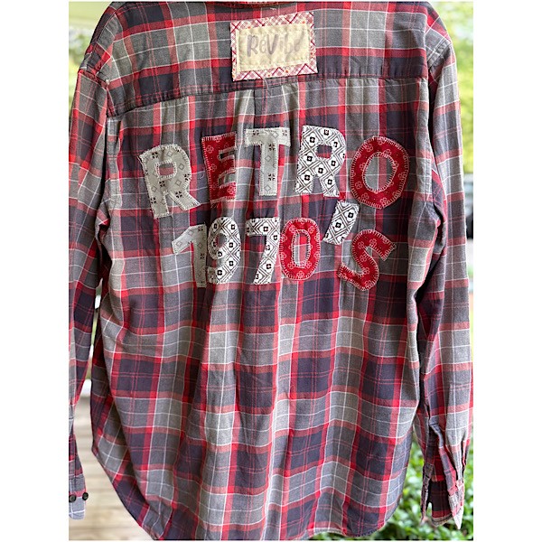Flannel: Red/Gray plaid w/ patches and Retro & 1970s appliques