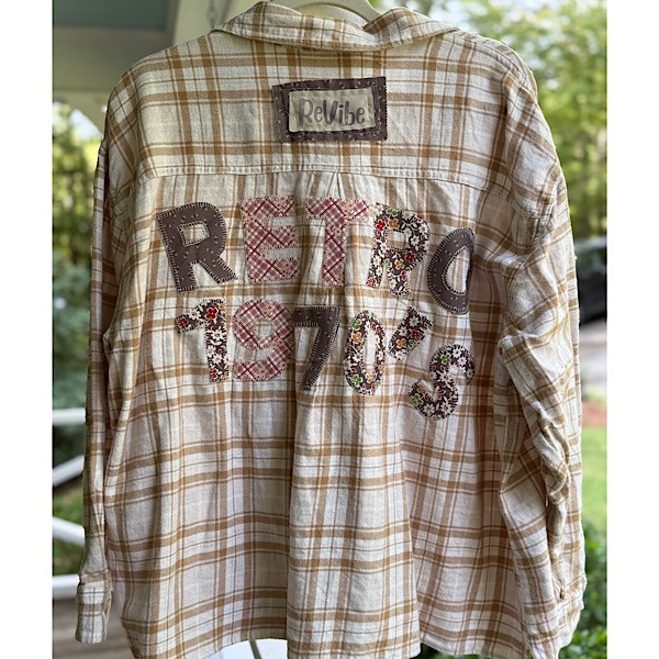 Flannel: Cream/Tab plaid w/ patches and Retro & 1970s appliques