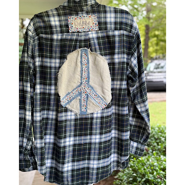 Flannel: Navy/Green/White plaid w/ patches and Peace Sign appliques