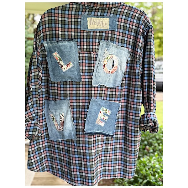Flannel: Rose/Periwinkle/Sage plaid w/ patches and heart, L O V E appliques