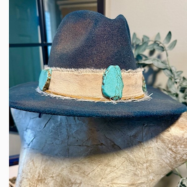 Hat: Teal tones w/cream velvet and leather bands accented with turquoise howlite stone