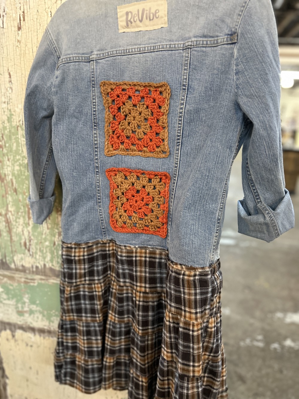 Duster: denim jacket with plaid skirting and granny squares on back