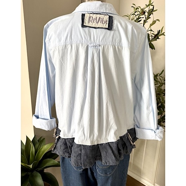 Shirt: Pale blue cotton button up cropped w/ruffle and stitched patches