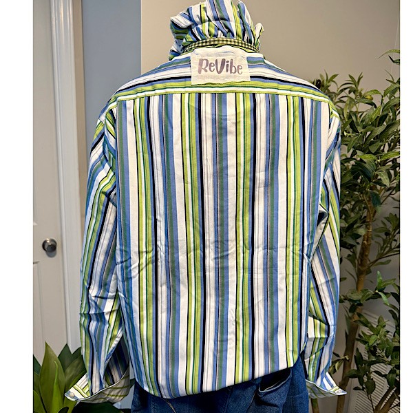 Shirt: Ruffled collar, cropped length button up shirt in blue/green stripes. Size L