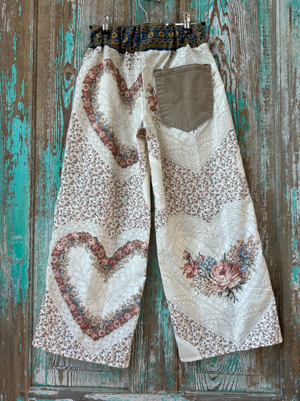 Strut your stuff with this one-of-a-kind pair of pants! Upcycled from vintage fabrics. Completely handmade! Elastic waistband with upcycled khaki pocket.