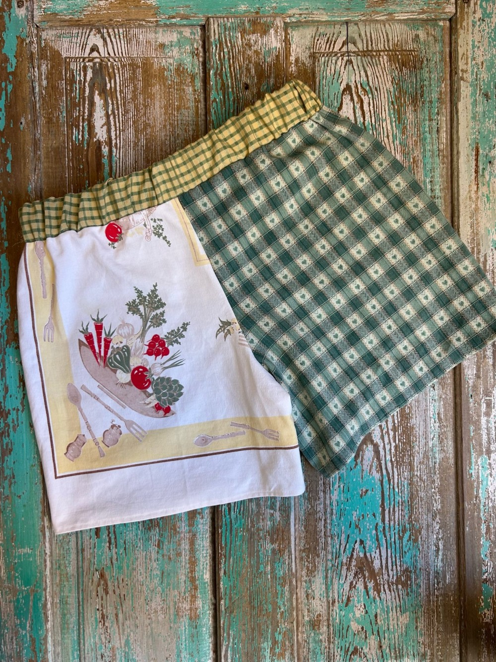 Strut your stuff with this one-of-a-kind pair of shorts! Upcycled from vintage tablecloths. Patched together by me! Elastic Waistband and vintage apron pocket.