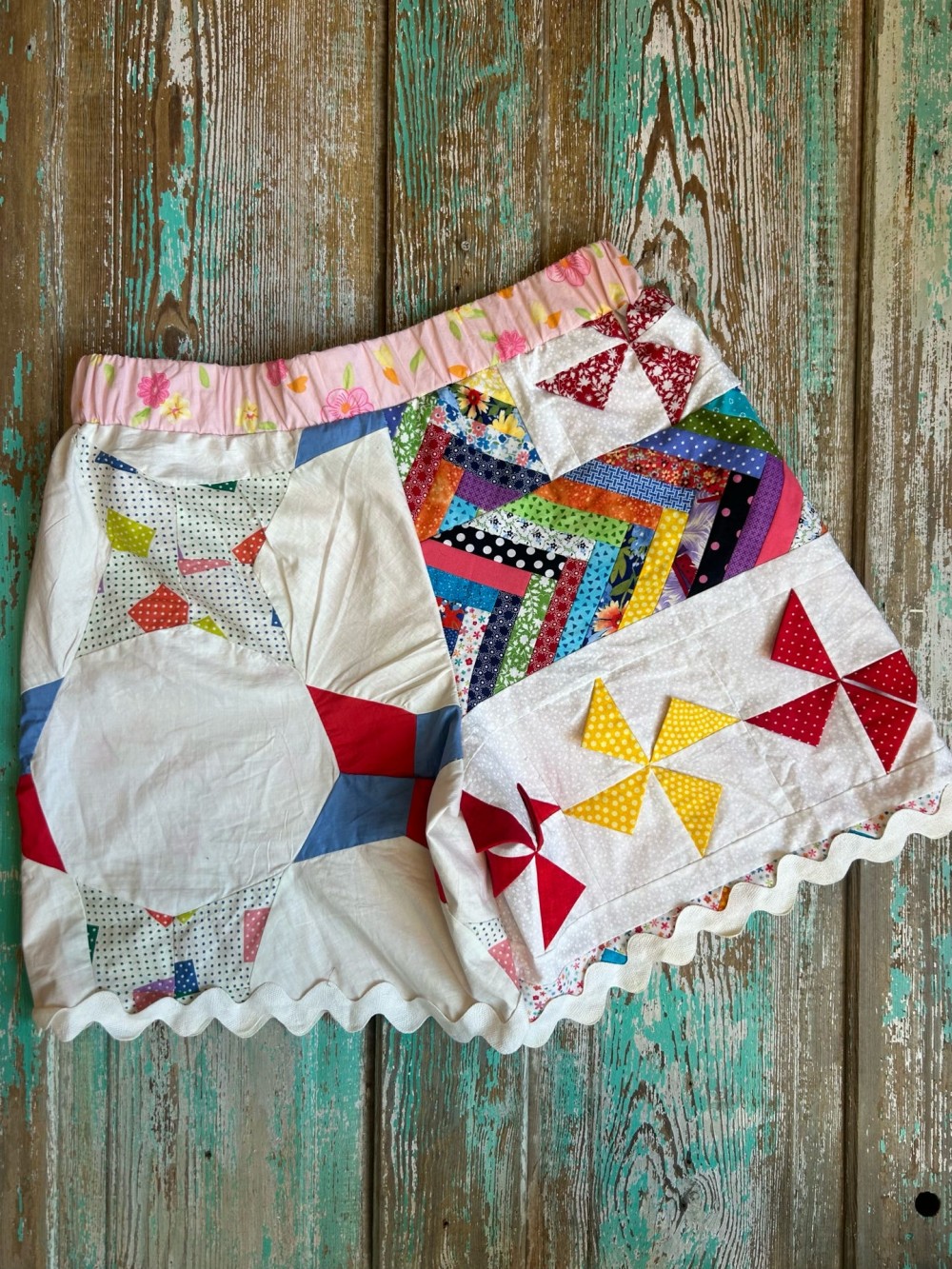 Strut your stuff with this one-of-a-kind pair of shorts! Upcycled from vintage quilt tops. Patched together by me! Elastic waistband and pockets large enough for a smartphone.