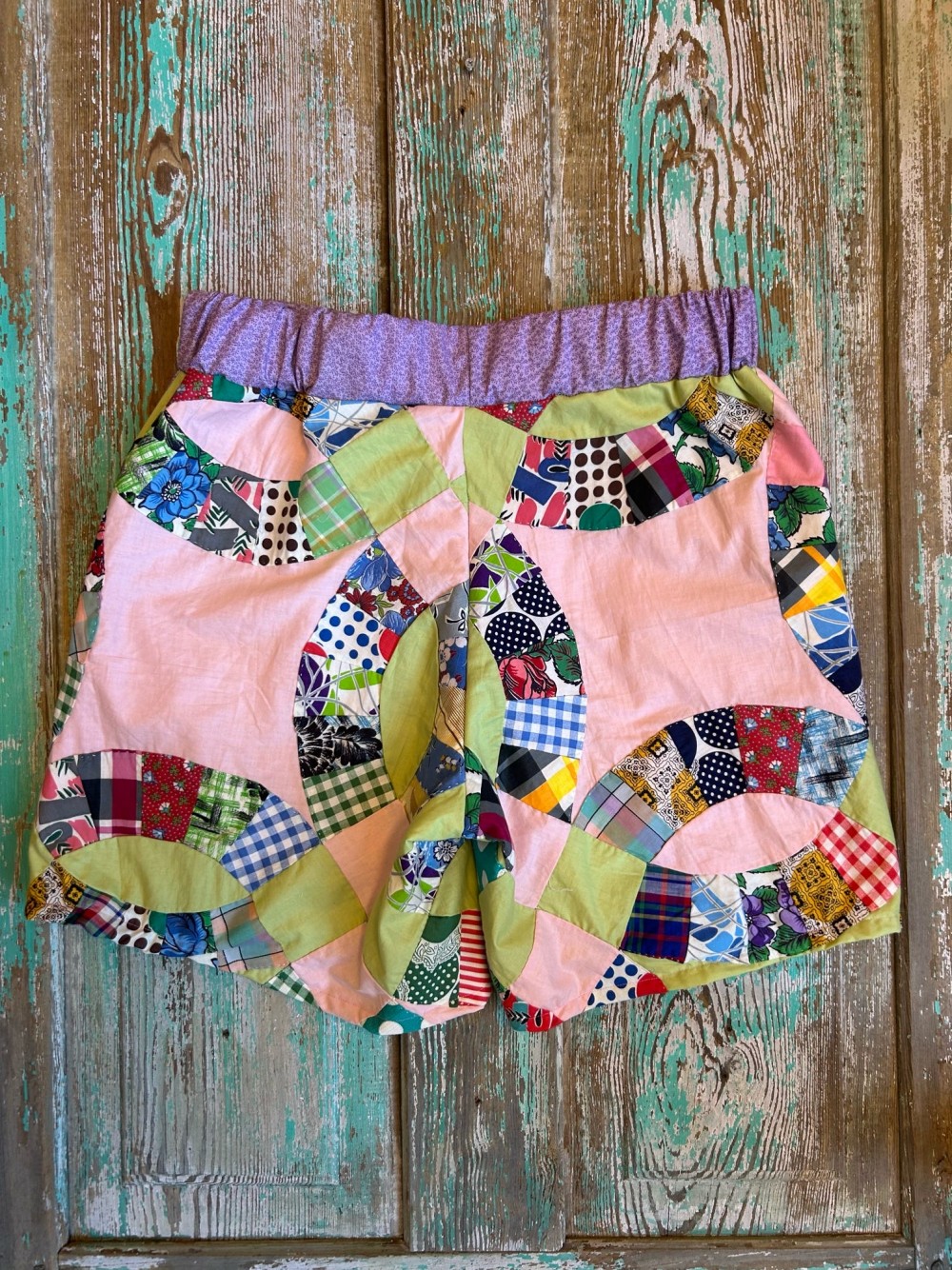 Upcycled from vintage quilts. Elastic waistband and pockets large enough for a smartphone.