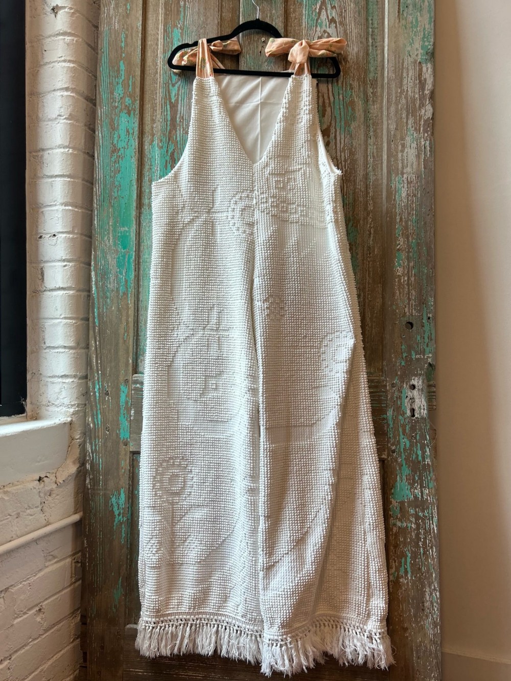 Strut your stuff with this one-of-a-kind pair of overalls, upcycled from a vintage chenille bedspread. Patched together by me!