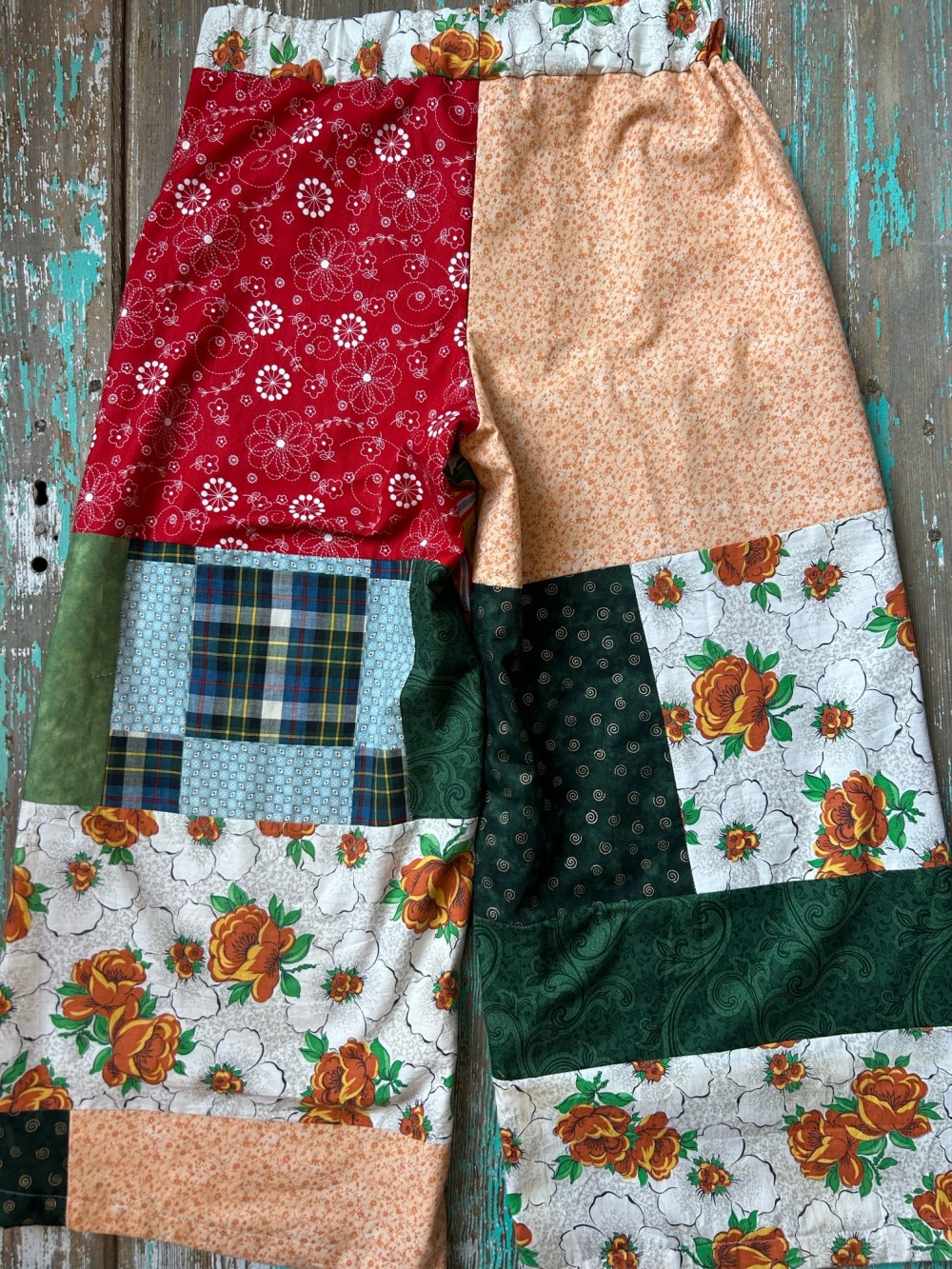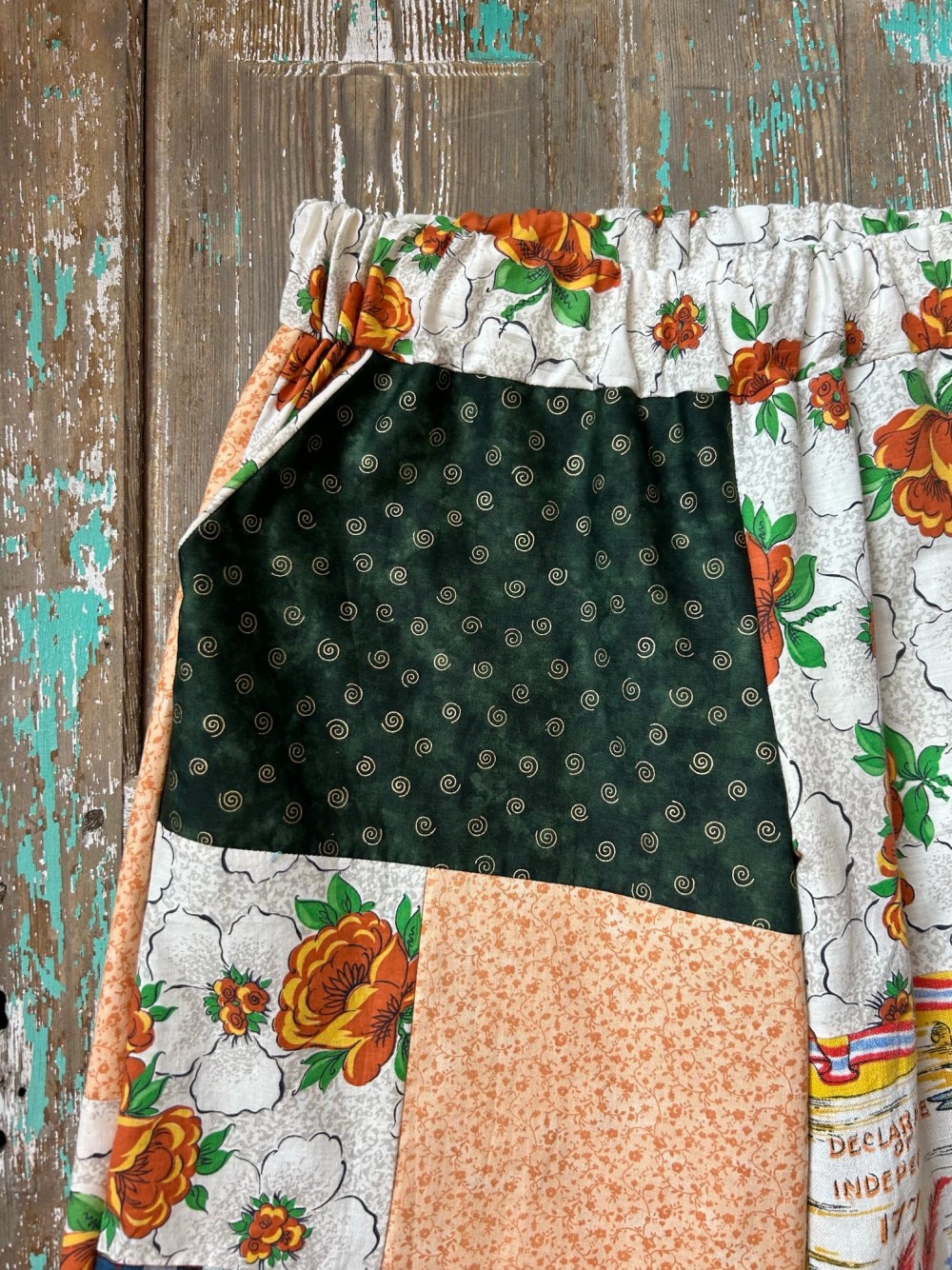 Upcycled Vintage 1976 Tea Towel & Quilt Square Pants with Pocket.