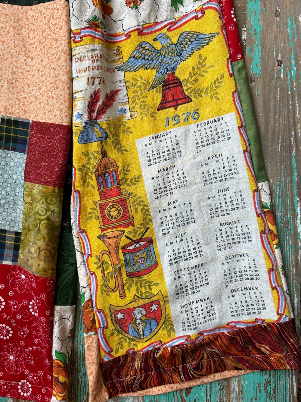 One-of-a-kind: Made from a vintage tea towel from 1976, vintage quilt squares, vintage cotton fabrics, and other vintage textiles. All sourced, patched together, and sewn by me!
